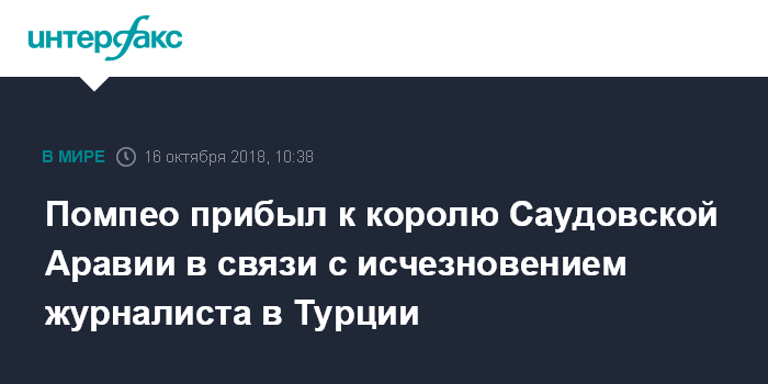 Москва. 16 октября. INTERFAX.RU - Глава госдепа США Майк Помпео во вторник приземлился в Эр-Рияде, где намерен провести встречу с королем Саудовской Аравии Салманом Аль Саудом и обсудить ситуацию с исчезновением саудовского журналиста Джамаля Хашкаджи в саудовском генконсульстве в Стамбуле.