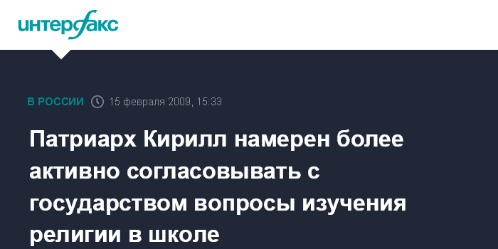 Москва. 15 февраля. INTERFAX.RU - Патриарх Московский и всея Руси Кирилл заявил о необходимости предпринимать более активные меры по взаимодействию с государством в вопросе преподавания в школе религиозных дисциплин.