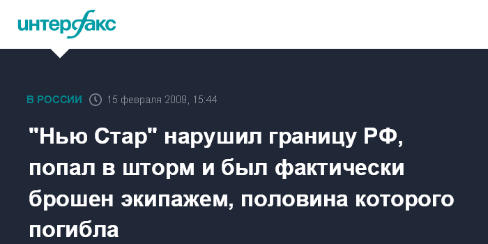 Владивосток. 15 февраля. INTERFAX.RU - Сухогруз "Нью Стар", половина экипажа которого погибла в штормовом море, покинул Находку без разрешения пограничных властей РФ и нарушил госграницу, заявила агентству "Интерфакс - Дальний Восток" руководитель пресс-группы Пограничного управления ФСБ России по Приморскому краю Наталья Рондалева.