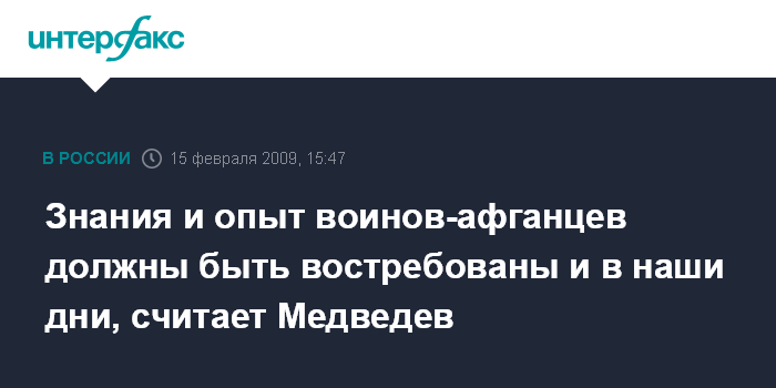 Москва. 15 февраля. INTERFAX.RU - Президент России Дмитрий Медведев отмечает значимость участия ветеранов войны в Афганистане в работе по воспитанию молодежи в духе патриотизма и призывает воинов-афганцев применять свои знания и опыт в различных сферах общественной жизни страны.
