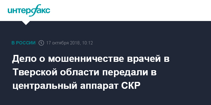 Москва. 17 октября. INTERFAX.RU - Председатель СК России Александр Бастрыкин поручил передать в центральный аппарат уголовное дело, возбужденное по фактам мошенничества со стороны медицинских работников в Тверской области. Об этом сообщила "Интерфаксу" официальный представитель СКР Светлана Петренко.