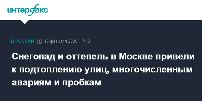 Москва. 15 февраля. INTERFAX.RU - Мокрый снег с дождем, идущий в столице практически без перерыва вторые сутки, привел к образованию большого числа подтоплений на улицах, передает корреспондент "Интерфакса".