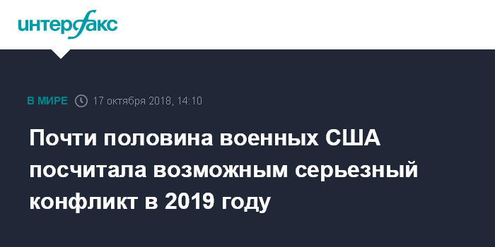 По мнению почти половины опрошенных, конфликт может произойти в течение 2019 года. Всего за два года подобной позиции стали придерживаться гораздо больше военнослужащих: в 2017 году на такой же вопрос утвердительно ответили лишь 5% американских военных.