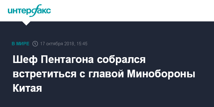 Москва. 17 октября. INTERFAX.RU - У шефа Пентагона Джеймса Мэттиса есть планы провести переговоры с главой Минобороны КНР Вэем Фэнхэ в Сингапуре после поступления от китайской стороны предложения о подобной встрече, заявил журналистам помощник министра обороны по делам Азиатско-Тихоокеанского региона Рэндалл Шривер.