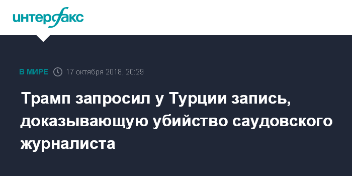 Москва. 17 октября. INTERFAX.RU - США запросили у турецких властей аудиозапись, которая, как считается, должна свидетельствовать об убийстве оппозиционного саудовского журналиста Джамаля Хашкаджи в генконсульстве Саудовской Аравии в Стамбуле, сообщает канал CNN со ссылкой на заявление Дональда Трампа.