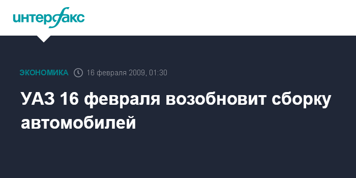 Ульяновск. 16 февраля. ИНТЕРФАКС - ОАО "Ульяновский автомобильный завод" ("УАЗ", входит в холдинг "Sollers") 16 февраля возобновит сборку автомобилей, сообщили "Интерфаксу" на предприятии.