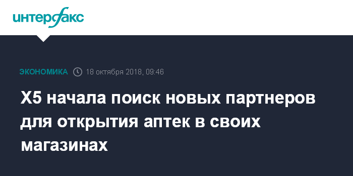 Москва. 18 октября. INTERFAX.RU - X5 Retail Group, крупнейший в России ритейлер, начал искать новых партнеров для открытия аптек при своих магазинах. Х5 обратилась к ряду крупных аптечных сетей с предложением о сотрудничестве, подразумевающем открытие в закассовых зонах ее магазинов аптечных точек, пишет "Коммерсантъ" со ссылкой на трех источников на фармрынке.