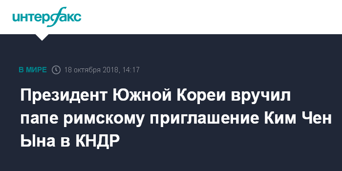 Москва. 18 октября. INTERFAX.RU - Президент Южной Кореи Мун Чжэ Ин в четверг во время встречи с папой римским в Ватикане вручил понтифику приглашение от лидера Северной Кореи Ким Чен Ына посетить КНДР, сообщает агентство "Ренхап".