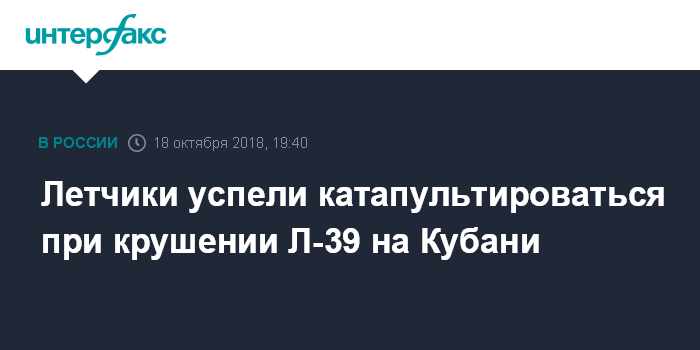 Москва. 18 октября. INTERFAX.RU - Летчики учебного самолета Л-39, который упал в Краснодарском крае, катапультировались, сообщил агентству "Интерфакс" информированный источник.