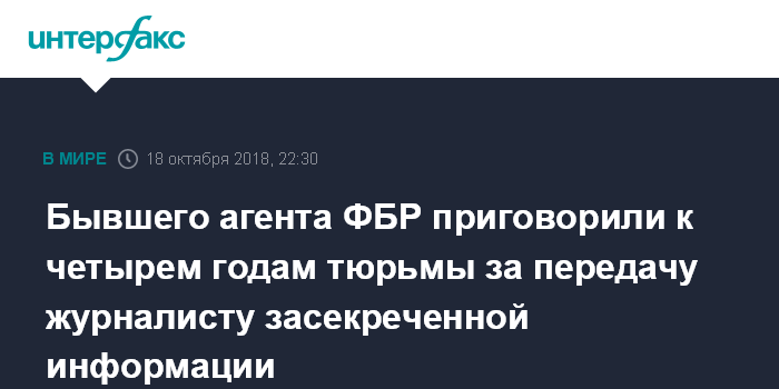 Москва. 18 октября. INTERFAX.RU - Бывшего сотрудника Федерального бюро расследований (ФБР) в Миннесоте приговорили к четырем годам тюремного заключения после того, как он признался в передаче засекреченных данных журналисту, сообщило в четверг агентство Associated Press.