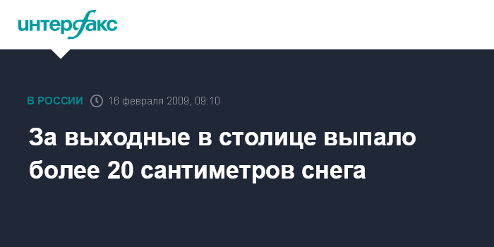 Москва. 16 февраля. INTERFAX.RU - За двое минувших суток, с начала мощного снегопада, в Москве выпал 21 см снега, сообщил "Интерфаксу" источник в комплексе городского хозяйства. Он уточнил, что в воскресенье утром прирост снега составлял от 6 до 15 см, а к утру понедельника, в общей сложности, выпал 21 сантиметр.