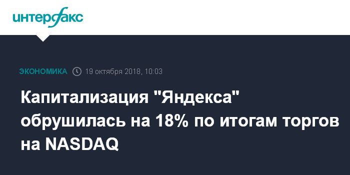 Капитализация "Яндекса" обрушилась на 18% по итогам торгов на NASDAQ