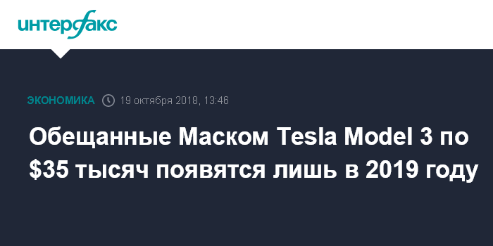 Москва. 19 октября. INTERFAX.RU - Tesla Inc объявила о старте продаж в США более бюджетной версии электромобилей Model 3, однако обещанные главой компании Илоном Маском массовые электрокары по $35 тысяч откладываются до 2019 года.