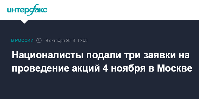 Москва. 19 октября. INTERFAX.RU - Московские власти рассматривают несколько уведомлений националистических движений о проведении в День народного единства 4 ноября шествий и митингов в городе, сообщила представитель столичного департамента региональной безопасности Елена Романова.