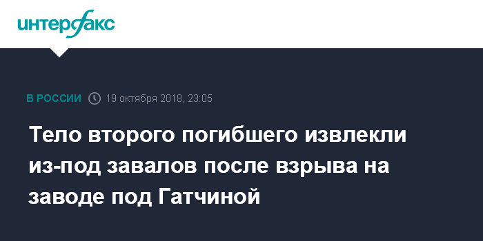 В свою очередь источник в экстренных службах города сообщил "Интерфаксу" в пятницу вечером, что спасатели обнаружили второго погибшего на месте взрыва на территории завода "Авангард" в Гатчинском районе Ленинградской области.