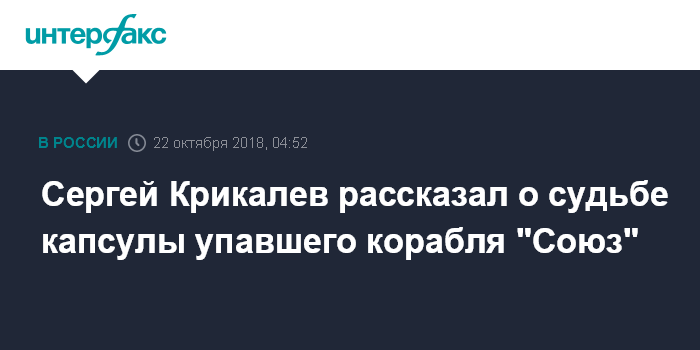 Москва. 22 октября. INTERFAX.RU - Спускаемый аппарат, в котором приземлились Алексей Овчинин и Ник Хейг, после аварии "Союза МС-10" ждет участь тренажера или музейного экспоната, сообщил исполнительный директор по пилотируемым космическим программам госкорпорации "Роскосмос" Сергей Крикалев в интервью, которое публикуют "Известия" в понедельник.