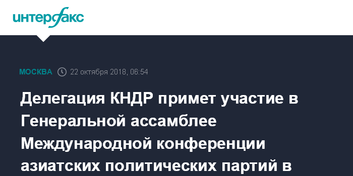 Москва. 22 октября. INTERFAX.RU - Делегация Трудовой партии Кореи в понедельник вылетела в Москву для участия в Х юбилейной Генеральной ассамблее Международной конференции азиатских политических партий, сообщается на странице Посольства РФ в КНДР в фейсбуке.