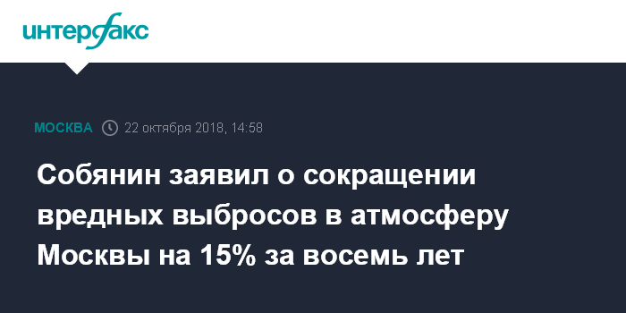 "В результате за последние восемь лет выбросы вредных веществ в атмосферу Москвы, несмотря на рост населения и автомобилей, не увеличились, а сократились на 15%", - подчеркнул мэр, выступая с ежегодным отчетом о деятельности правительства Москвы в Мосгордуме в понедельник.