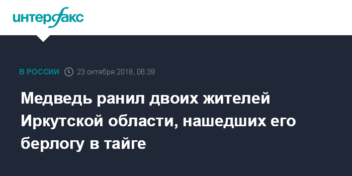 Москва. 23 октября. INTERFAX.RU - Медведь напал на двоих жителей Тайшетского района Иркутской области, оба мужчины с травмами госпитализированы, сообщили во вторник агентству "Интерфакс" в пресс-службе Главного управления МВД по региону.