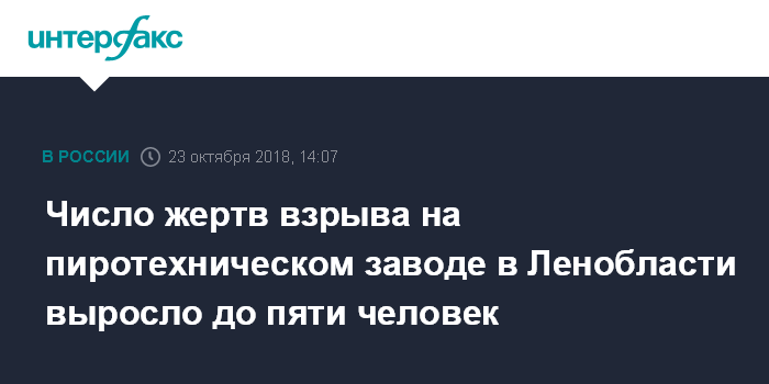 Как сообщалось, 19 октября на пиротехническом заводе "Авангард" в Гатчинском районе Ленобласти произошел взрыв. Ранее сообщалось о четырех погибших в результате происшествия - гражданине Белоруссии и трех гражданах Узбекистана. СКР возбудил уголовное дело уголовное дело, фигурантами которого стали главный инженер и директор завода.