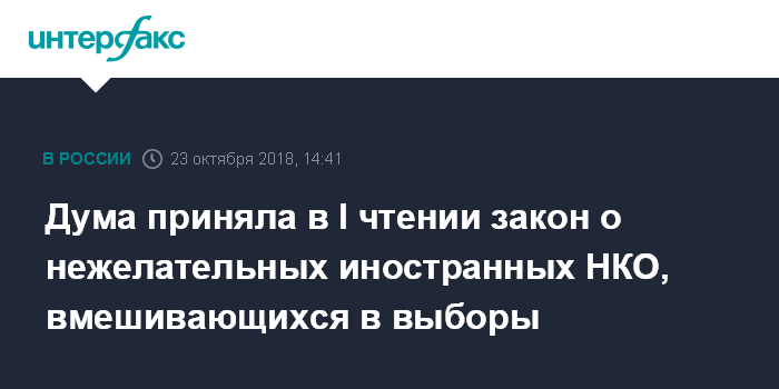 Москва. 23 октября. INTERFAX.RU - Государственная Дума на заседании во вторник приняла в первом чтении законопроект о признании нежелательными на территории РФ иностранных НКО, которые вмешиваются в выборы.
