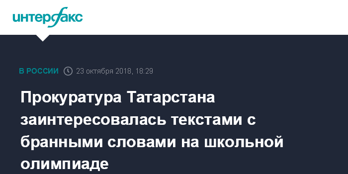 Москва. 23 октября. INTERFAX.RU - Прокуратура Татарстана заинтересовалась информацией о том, что в Казани на олимпиаде по литературе учащимся для анализа были предоставлены тексты, содержащие бранные слова.