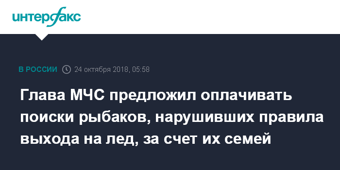 Москва. 24 октября. INTERFAX.RU - Глава МЧС РФ Евгений Зиничев предложил взыскивать с рыбаков, которые вопреки официальным предупреждениям вышли на лед, попали в чрезвычайную ситуацию и были спасены экстренными службами, взыскивать затраты на их спасение.