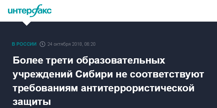 Москва. 24 октября. INTERFAX.RU - Более трети объектов образования, культуры и спорта в Сибири не соответствуют требованиям антитеррористической защищенности, сообщил секретарь Совета безопасности РФ Николай Патрушев.