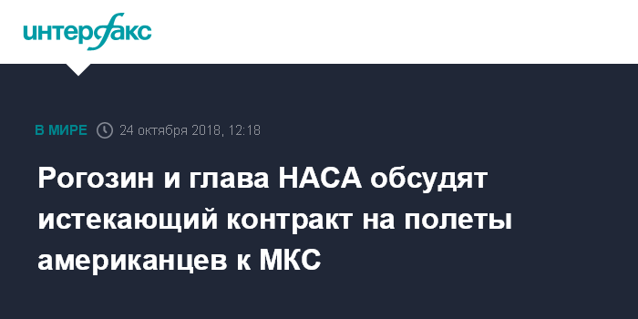 Москва. 24 октября. INTERFAX.RU - "Роскосмос" и НАСА (NASA) пока не согласовали даты и окончательную повестку переговоров между главами двух организаций Дмитрием Рогозиным и Джимом Брайденстайном в США, в числе прочих вопросов они могут обсудить судьбу полетов астронавтов НАСА к МКС, сообщили "Интерфаксу" в пресс-службе "Роскосмоса".
