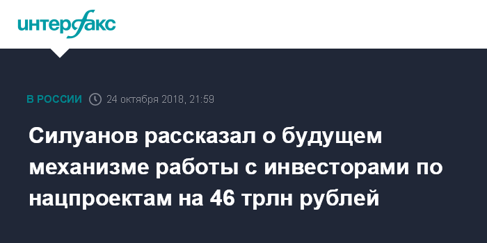 "Мы с РСПП ведем активную работу по привлечению частного капитала в реализацию нацпроектов. В рамках этой работы представлено 729 проектов общим объемом 46 трлн рублей. До конца года мы планируем подписать меморандум о взаимодействии между инвесторами, отраслевыми министерствами, РСПП", - заявил первый вице-премьер, министр финансов Антон Силуанов, выступая на совете по стратегическому развитию и национальным проектам в Кремле.