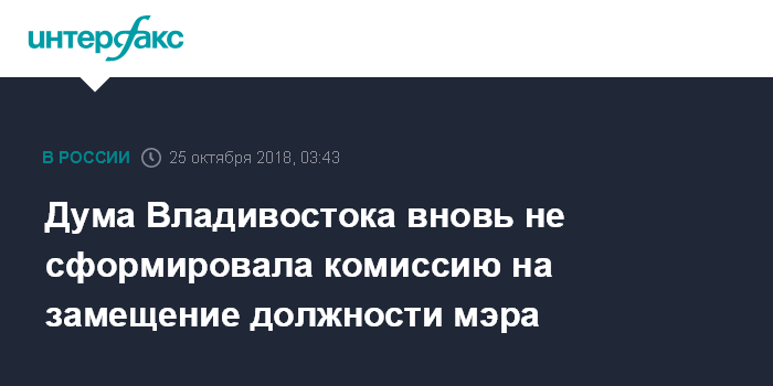 Москва. 25 октября. INTERFAX.RU - Дума Владивостока в четверг со второй попытки не смогла сформировать комиссию, которая отбирает кандидатов на пост мэра города, этот вопрос был исключен из списка.