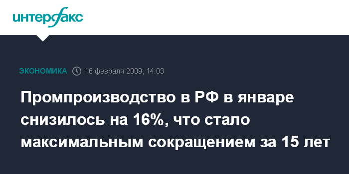 Снижение в промышленности в январе 2009 года стал максимальным с октября 1994 года (тогда промышленность упала в годовом сравнении на 18%), в сентябре 1998 года падение промпроизводства в РФ составило 15%.