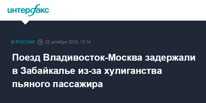 Москва. 25 октября. INTERFAX.RU - РЖД в четверг задержало поезд N99 Владивосток-Москва на станции Малоковали в Забайкальском крае из-за хулиганских действий одного из пассажиров, сообщает пресс-служба Забайкальской железной дороги.