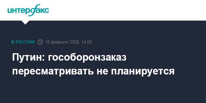 Москва. 16 февраля. INTERFAX.RU - Премьер-министр РФ Владимир Путин заявил об отсутствии необходимости существенного пересмотра планов по гособоронзаказу на ближайшие два-три года. "Хочу подчеркнуть, что, как я уже говорил, нет никакой необходимости существенным образом пересматривать наши планы по государственному оборонному заказу", - сказал Путин. Такое заявление он сделал в ходе рабочей встречи с вице-премьером РФ Сергеем Ивановым, главой Минобороны РФ Анатолием Сердюковым, главой Сбербанка РФ Германом Грефом и гендиректором госкорпорации "Ростехнологии" Сергеем Чемезовым.