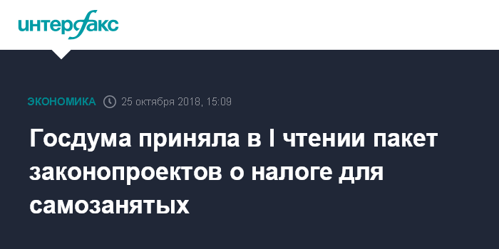 Москва. 25 октября. INTERFAX.RU - Госдума РФ на заседании в четверг приняла в первом чтении пакет законопроектов о введении налога на профессиональный доход.