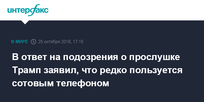 Москва. 25 октября. INTERFAX.RU - Президент США Дональд Трамп прокомментировал недавнюю публикацию The New York Times о том, что он игнорирует предупреждения спецслужб об угрозе прослушки и пользуется личным мобильным телефоном. Американский лидер заявил, что вообще очень редко пользуется сотовым телефоном.