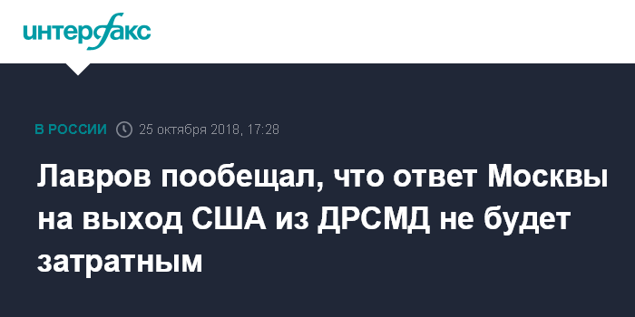 Москва. 25 октября. INTERFAX.RU - Россия не будет отвечать на выход США из Договора о ликвидации ракет средней и меньшей дальности (ДРСМД) затратными методами, как это было во времена гонки вооружений, заявил в четверг глава МИД РФ Сергей Лавров.