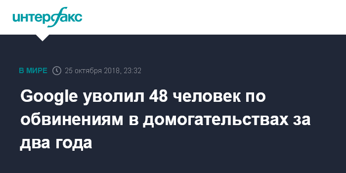 Москва. 25 октября. INTERFAX.RU - В компании Google за два года уволили 48 человек, в том числе 13 топ-менеджеров, по обвинениям в сексуальных домогательствах, сообщает в четверг BBC News со ссылкой на письмо CEO Сундара Пичаи подчиненным.
