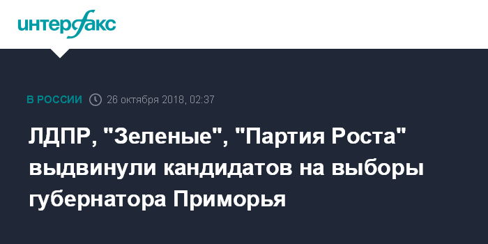 Москва. 26 октября. INTERFAX.RU - Либерально-демократическая партия России, "Партия Роста" и "Зеленые" выдвинули своих кандидатов на предстоящие выборы губернатора в Приморье, сообщили в пятницу "Интерфаксу".