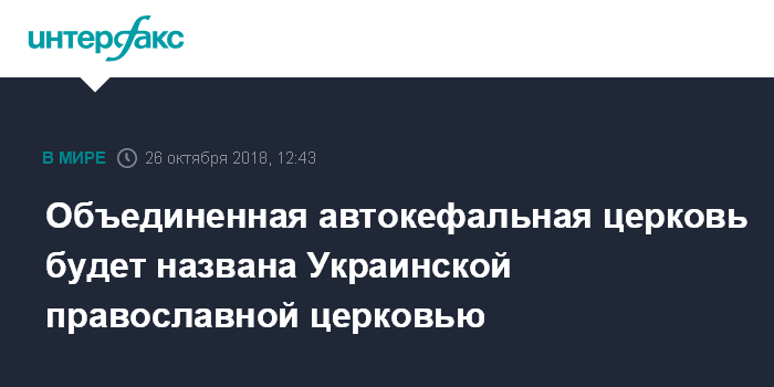 Москва. 26 октября. INTERFAX.RU - Объединенная церковь на Украине получит название Украинская православная церковь, сообщают в УПЦ Киевского патриархата.