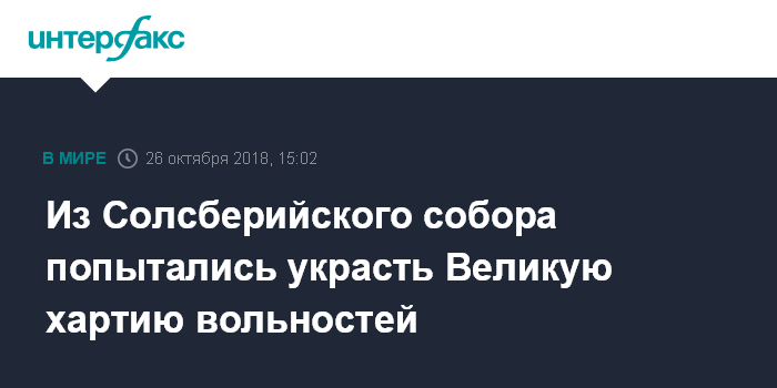 Москва. 26 октября. INTERFAX.RU - Из всемирно известного собора в британском городе Солсбери попытались украсть хранившийся там экземпляр подписанной в XIII веке Великой хартии вольностей, сообщает в пятницу Sky News.