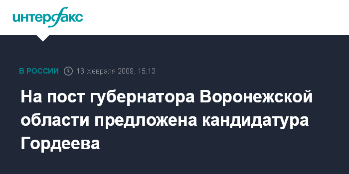 Москва. 16 февраля. INTERFAX.RU - Президент России Дмитрий Медведев направил письмо председателю Воронежской областной думы, в котором в соответствии с законодательством внес на рассмотрение законодательного органа кандидатуру Алексея Гордеева для наделения его полномочиями губернатора Воронежской области, сообщила в понедельник пресс-служба главы российского государства.