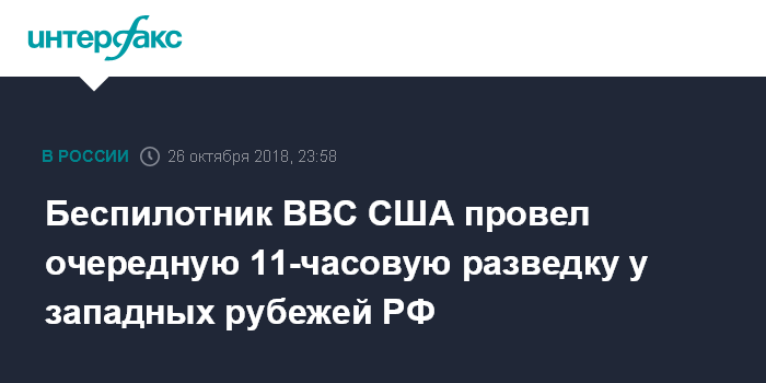 Москва. 26 октября. INTERFAX.RU - Стратегический беспилотный летательный аппарат ВВС США RQ-4B Global Hawk, способный вести разведку на сотни километров в глубину территории противника, в пятницу совершил 11-часовой полет вблизи границ России в регионе Балтики, следует из мониторинговых данных западных авиационных ресурсов.