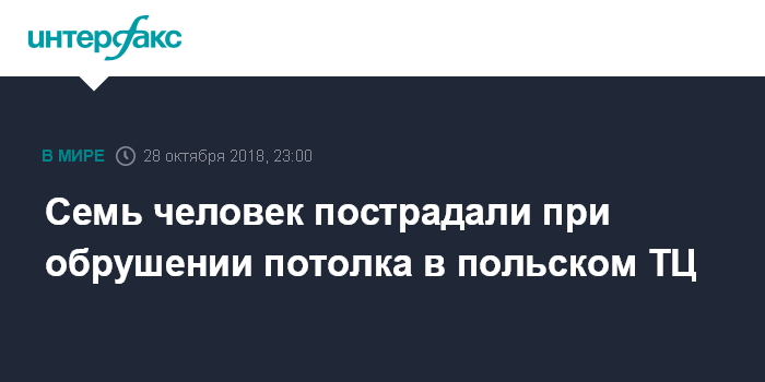 Москва. 28 октября. INTERFAX.RU - Семь человек пострадали в результате обрушения подвесного потолка в торговом центре в городе Жешув на юго-востоке Польши, сообщает в воскресенье издание Rzeszów News.