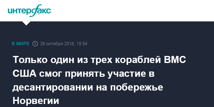Москва. 29 октября. INTERFAX.RU - Лишь один десантный корабль - "Иводзима" - из состава амфибийно-десантной группы ВМС США, в которую также входят корабли "Ганстон Холл" и "Нью-Йорк", в понедельник в рамках учений смог принять участие в высадке американских морских пехотинцев на побережье Норвегии, сообщается в твиттере бельгийского оборонного ведомства.