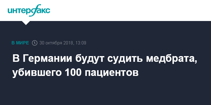 Москва. 30 октября. INTERFAX.RU - Бывший медбрат Нильс Хёгель предстанет перед судом города Олденбург на севере Германии. Как сообщает "Би-би-си", 41-летний мужчина обвиняется в убийстве 100 своих пациентов.