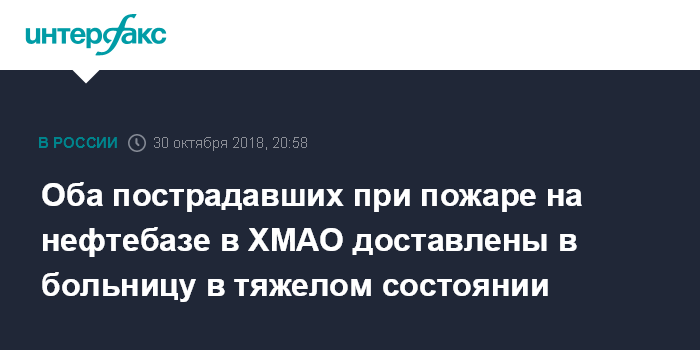 Москва. 30 октября. INTERFAX.RU - Второй пострадавший при пожаре на Хохряковском месторождении в ХМАО-Югре доставлен в Нижневартовскую окружную клиническую больницу.