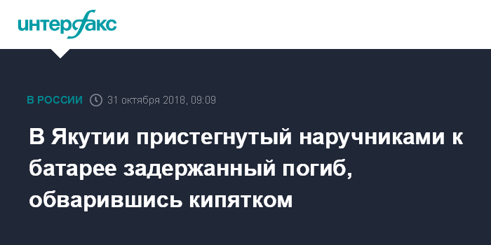 Москва. 31 октября. INTERFAX.RU - Якутские следователи расследуют гибель местного жителя, обварившегося кипятком из батареи, к которой его пристегнул полицейский после задержания за хулиганство, сообщили в пресс-службе Следственного комитета (СК).