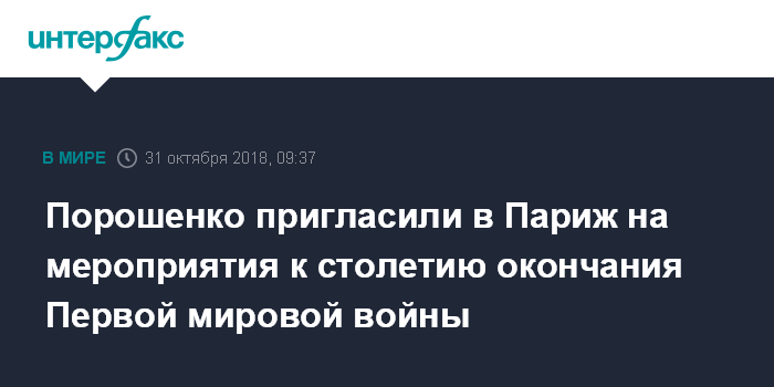 Москва. 31 октября. INTERFAX.RU - Президент Украины Петр Порошенко получил приглашение от своего французского коллеги Эммануэля Макрона посетить Париж 10-11 ноября по случаю столетия окончания Первой мировой войны, сообщили "Интерфаксу" в администрации президента Украины.