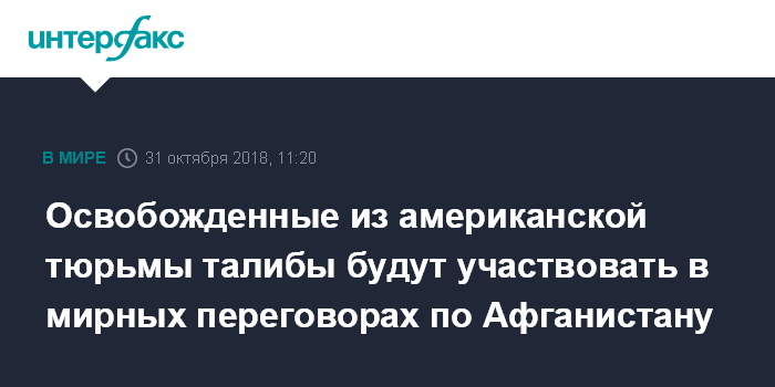Москва. 31 октября. INTERFAX.RU - Пять членов движения "Талибан" (запрещено в РФ), которых в 2014 году освободили из центра задержания на американской военной базе в Гуантанамо, теперь будут принимать участие в мирных переговорах по Афганистану, передает агентство Associated Press со ссылкой на представителя талибов Забиуллу Муджахида.